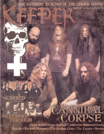 Issue Eleven sees the peak of Keeper’s coverage of underground Hardcore bands with interviews from Bleeding Through, The Locust, Atreyu, Scars of Tomorrow, Backup Plan and Some Kind of Hate along with long time metal stalwarts like Cannibal Corpse and Deicide… probably the most hardcore/sXe contact in the magazine’s lifespan. This is the last issue published under the original ownership and Issue 12 shifts focus back towards Metal and the interests of the new ownership… so stay tuned for that!