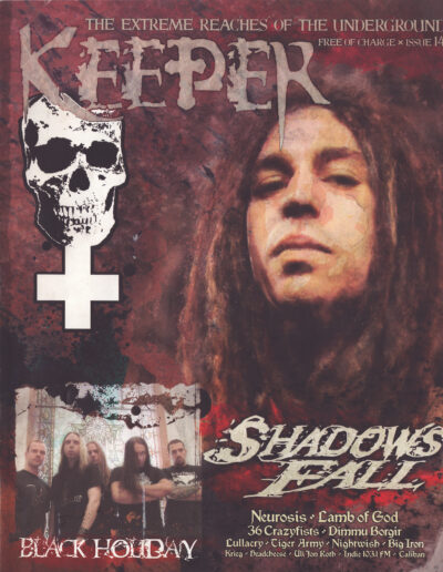 Issue Fourteen sees the return of few big names like Dimmu Borgir and Lamb of God and the appearance of few underground favorites like Black Holiday, Krieg and Caliban. The text features begin to be shorter but the total page count remains since there’s many more full page photos and illustrations to make up for it. I’m particularly fond of the black metal homonid illustration and the Lamb of God graphic design. Issue 14 came out amidst a presidential election in the USA and we have one ad from Punk Voter delineating the candidates positions and another ad from American Streak Records for a conservative “punk” compilation called Crush Kerry. (It even features a now un-Google-able band called “Epstein”!) Strange times that only got stranger… A fun fact about this issue is that not only did I layout and design the thing but I also did a few random advertisements inside like for Lucky Strike Lanes and Party Poker… like I said, weird times. Strangely enough, the only live show review in this issue is covering Ozzfest 2004 — written, of course, by the amazing Jeff Easton, who along with Kerri Lynn DeHart, is essentially keeping the magazine alive with their contributions!