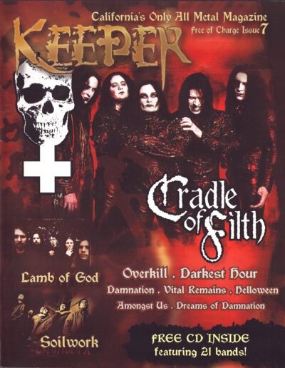 Issue Seven came with a free CD inside that was hand-stapled to each issue–it took forever. Clocking in at 76 pages this was the biggest Keeper yet and featured some of the heavy weight contributors that would keep the magazine running in the coming years, namely Jeff Easton and Kerri Lynn DeHart. Somehow I didn’t credit myself for the Soilwork or Amongst Us interviews… probably an honest mistake and somehow the Lamb of God interview is missing the byline for Leah Collery. Sorry! Issue Seven really captures the wide range of underground heavy music that made up the Metal scene in the early 21st Century–from the metal-core of Darkest Hour to the new American death metal of Lamb of God with a dash of that big Goethenburg-sound of Soilwork along with some classics like the German power metal of Helloween and classic American death of Vital Remains. What a time!